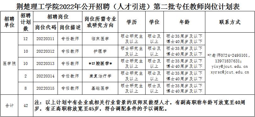 荆楚理工学院医学院2022年公开招聘专任教师具体岗位及条件详见下表(附件1):