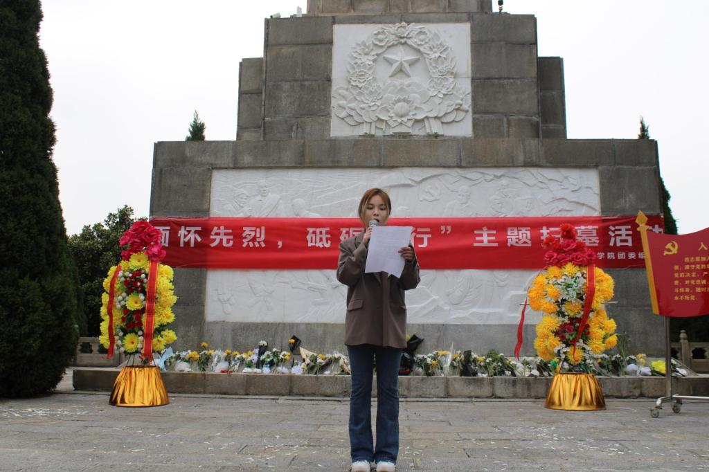 本次活动共分为五项,活动第一项:学生代表向革命先烈敬献花篮;活动第二项:全体学生烈士纪念碑鞠躬,并默哀三分钟;活动第三项:党员代表钱雨涵上台发言,呼吁党员们牢记光荣使命和历史责任,学生代表王雅欣致悼词,表达对革命先烈的敬仰;活动第四项:领誓人卿若男带领学生党员重温入党誓词;活动第五项全体学生按队列有序的敬献小白花,并参观烈士陵园,更加深入地了解烈士的英雄事迹。