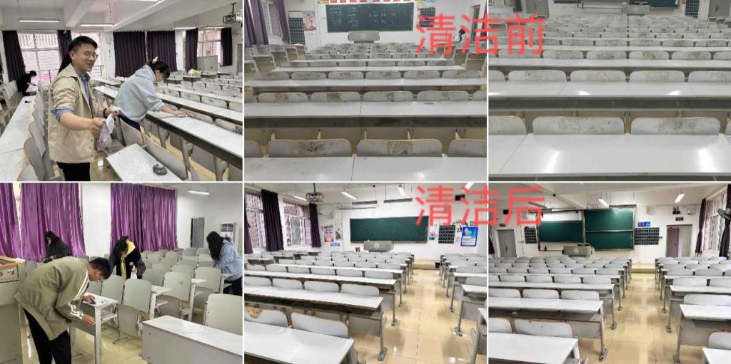 活动开始前,负责人就课桌椅的清洁要求及注意事项做了详细说明和分工。活动期间,在12名负责人的带领下,志愿者们分工明确、热情高涨、干劲十足。为清除课桌上的笔墨和广告贴纸的痕迹,志愿者们用清洁剂,砂纸打磨,毛巾擦拭等方法进行清理。经过志愿者们两个多小时的努力,本次清除课桌星空(中国)顺利完成,43间教室的4887张课桌焕然一新。