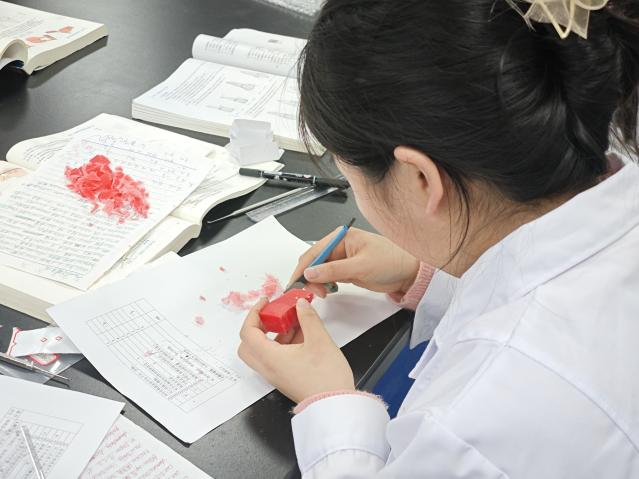 为秉持比赛公开、公平、公正的原则,由医学部口腔医学系唐瑞平、伍廷芸、曾小芳、常洁老师担任评委,医学部团委学生会社团部和口腔与护理保健协会全程监督。比赛开始后,参赛选手全身心地投入其中,娴熟地拿起工具进行测量、划线、粗雕、精修、抛光,蜡块逐渐退去雏形,变成了一颗颗精致的牙齿。在比赛过程中,选手们以娴熟的操作、灵活的手法展现出扎实的专业技能基本功。36名成功晋级决赛的选手在现场90分钟内完成上颌中切牙的雕刻成形。赛后,评委老师根据其作品完成度、牙体解剖形态,结合评分标准做出了综合评价,最终评出一等奖5名、二等奖10名、三等奖14名,并对获奖学生给予表彰。