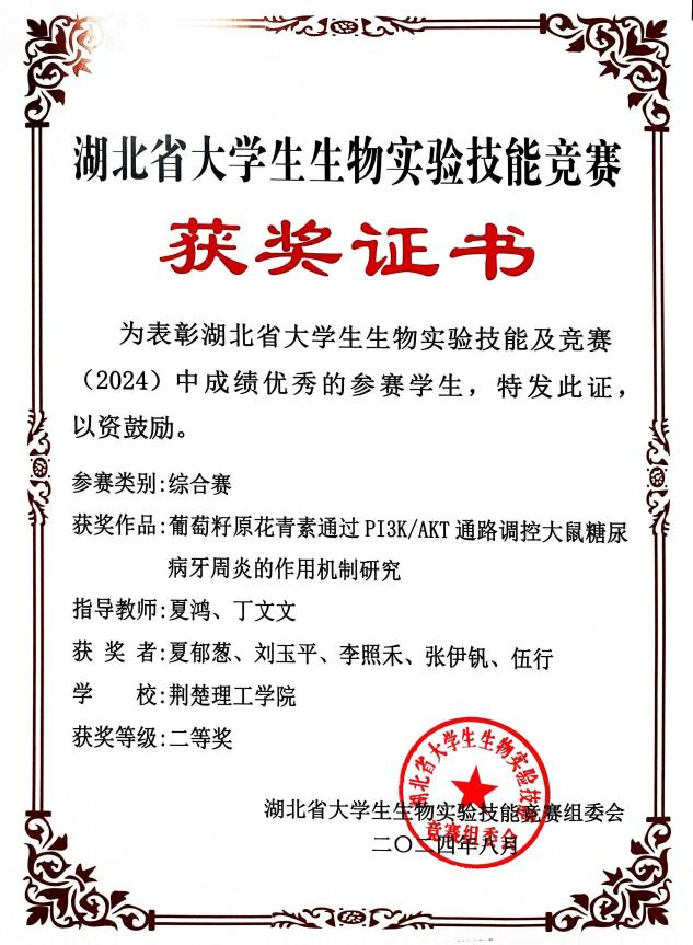 自赛事启动以来,荆楚理工学院医学部高度重视,全方位支持、多方面保障。丁文文等老师在备赛期间悉心指导学生规范操作、沉着应战,学生团队相互鼓励、共同努力获得了大赛二等奖。