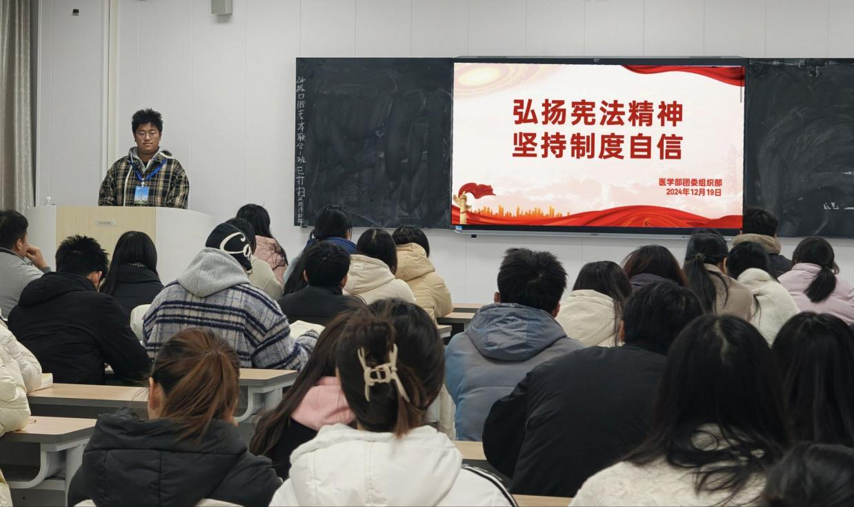 本报讯(记者 王淑瑜)为深入学习贯彻习近平法治思想,引导团员青年学习宪法知识,弘扬宪法精神,维护宪法权威,推动宪法实施,12月19日晚,“弘扬宪法精神,坚持制度自信”主题团日活动在医学大楼A108教室顺利开展。