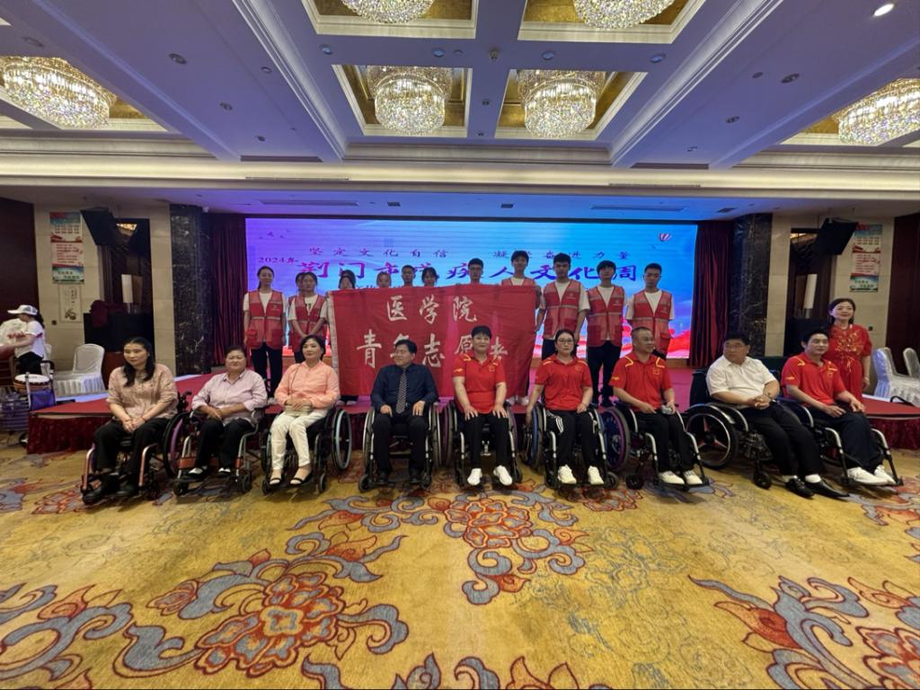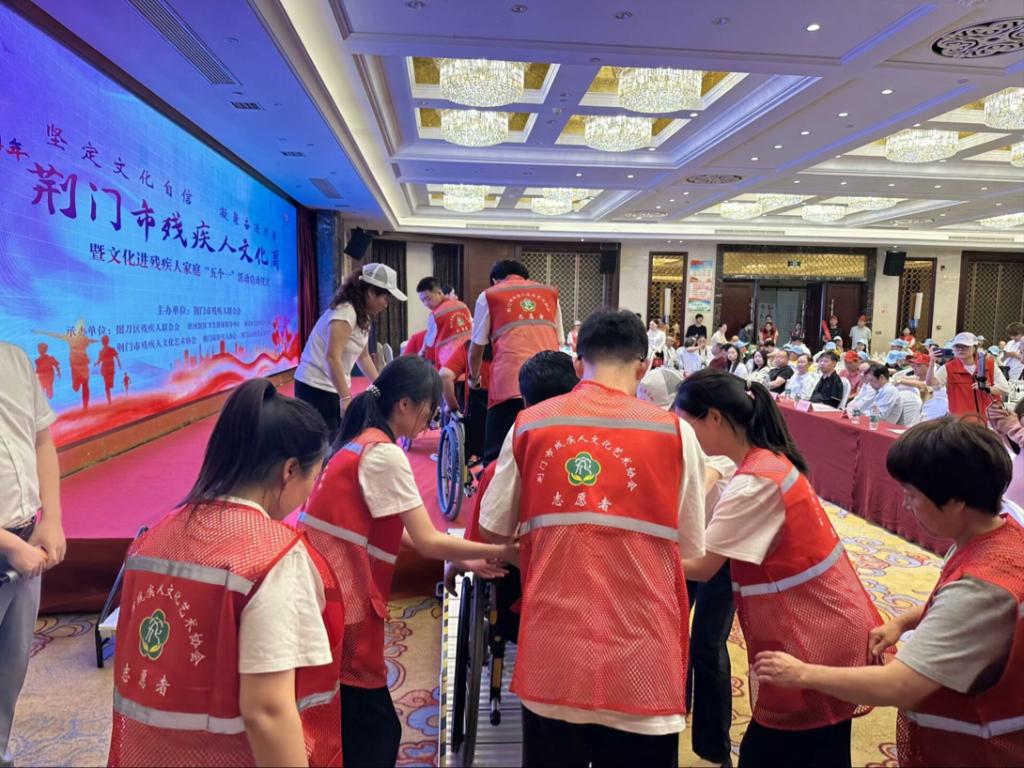活动前,医学部志愿者们协助整理现场,帮助近300名残疾人朋友签到后,带领残疾人朋友及其家属一同参观荆门市残疾人文化艺术作品、文创产品展览。活动开始后,荆门市肢残人协会代表各承办机构致欢迎辞;荆门市委常委、统战部长刘振军上台讲话,并为爱心企业授牌,感谢他们对残联的支持;爱心助残企业代表荆门展翔文化用品有限公司发言;荆门市肢残人协会副主席刘莎莎带领学习党的二十大精神以及习近平文化思想;新天律师事务所邹涛律师带领学习无障碍环境建设法。最后,残疾人朋友进行了文艺表演,展现了生命的无限可能性。