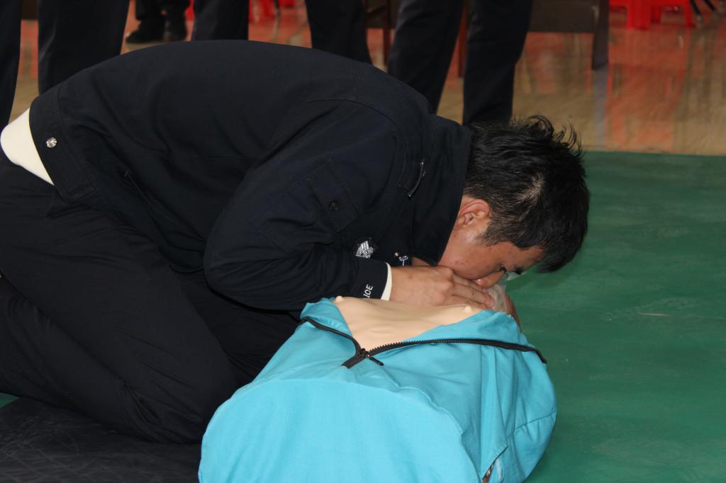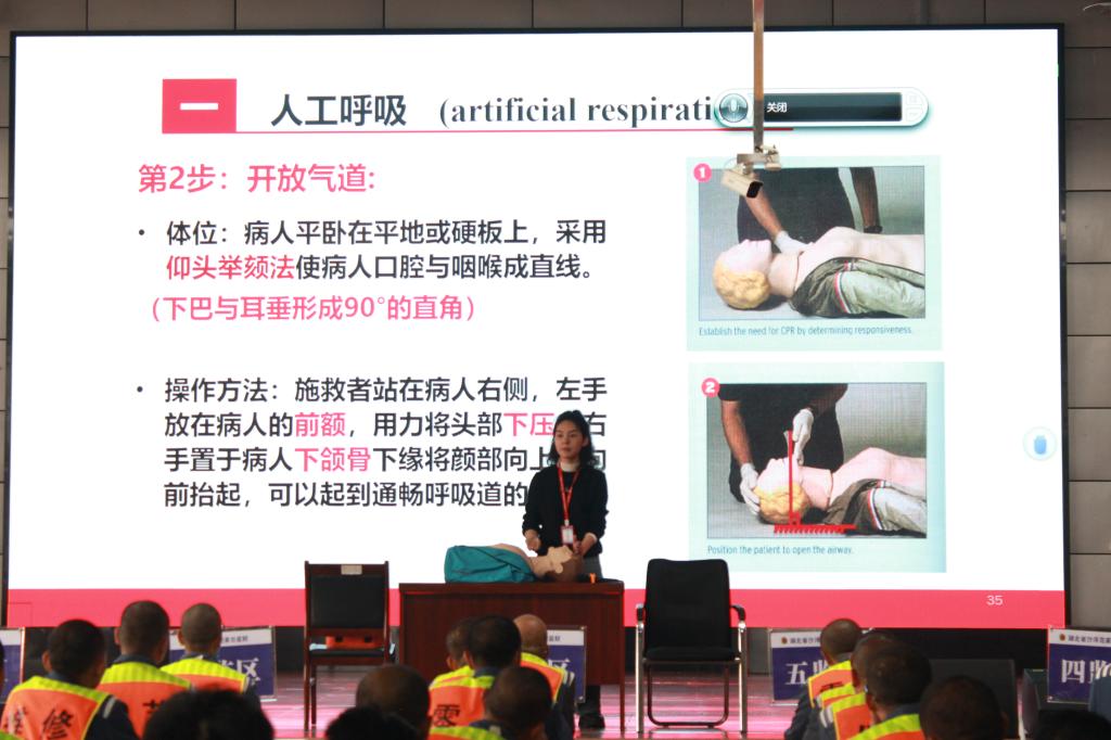 培训分为理论授课、实践操作和结业考核三个环节。在理论授课环节,培训讲师针对海姆立克救援法、心肺复苏法和AED救援设备使用、止血包扎及固定的方法进行了现场演示,深入浅出讲解急救原理和操作要求,并通过列举事例,对判断被救护人员呼吸停止的方式、心肺复苏的指征、救助中的注意事项及复苏成功的指标等内容进行详细说明。